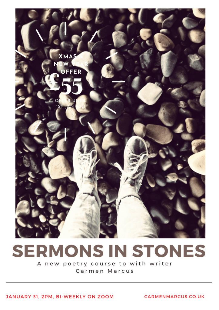 Poetry, more than any other form is rooted in our physical connection to the earth and our bodies, and for that reason it has a kind of sacred power, poetry is a way to unlock the mystery inside even the most unreadable objects – so I hope you’ll join me to find those ‘sermons in stones’.